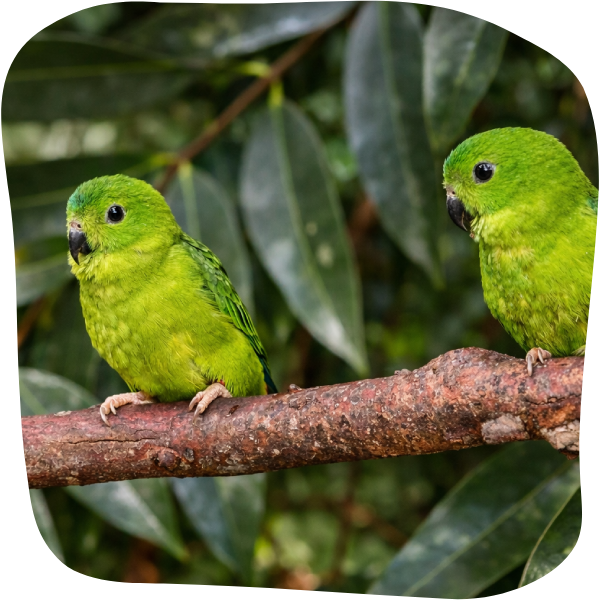La diversité se prolonge avec de petites espèces de perroquets multicolores, comme les loris de Papouasie et les Coryllis à tête bleue, oiseaux vifs, joueurs et expressifs, typiques des forêts et îles du Pacifique.