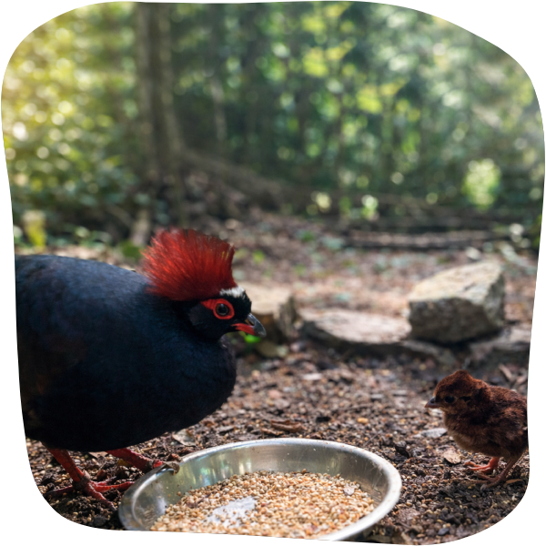 Les roulouls couronnés, petites perdrix des forêts équatoriales d’Asie, se déplacent principalement au sol, tandis que les Ptilopes porphyres, colombes tropicales rares et colorées, évoluent plus discrètement dans la végétation.